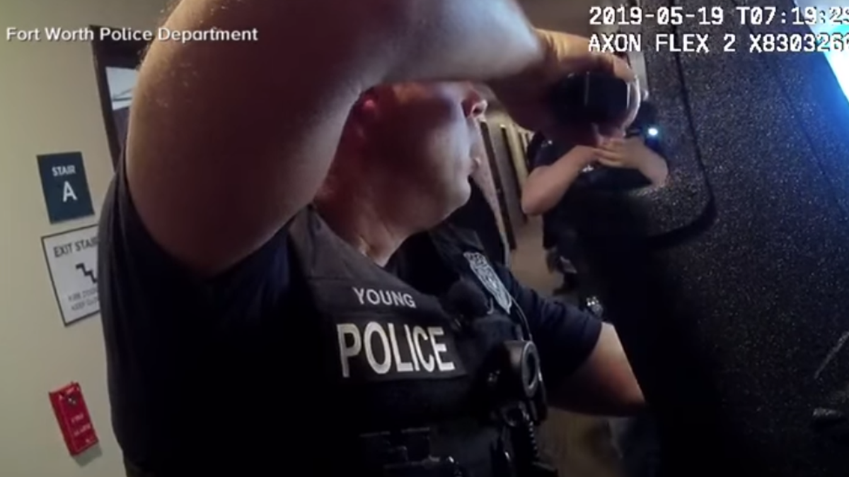 The body camera footage shows the heavily armed officers using a battering ram to open the hotel door, with Webb eventually emerging from the room completely naked.